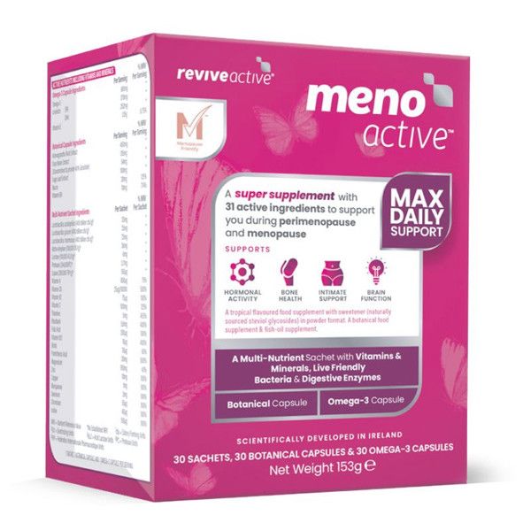 Meno Active je sestavený speciálně pro všechny ženy procházející náročným obdobím menopauzy. Obsahuje celkem 31 (!) bioaktivních složek (v sáčku, rostlinných kapslích a speciálních rostlinných enterických kapslích) pokrývajících všechny hlavní oblasti (fyzické i psychické) spojené s menopauzou. Meno Active poskytuje podporu pro oblast hormonů, intimní oblast, nervovou soustavu, mozek, kosti, srdce, energii, tvorbu kolagenu, hladinu krevní glukózy a mikrobiomu.