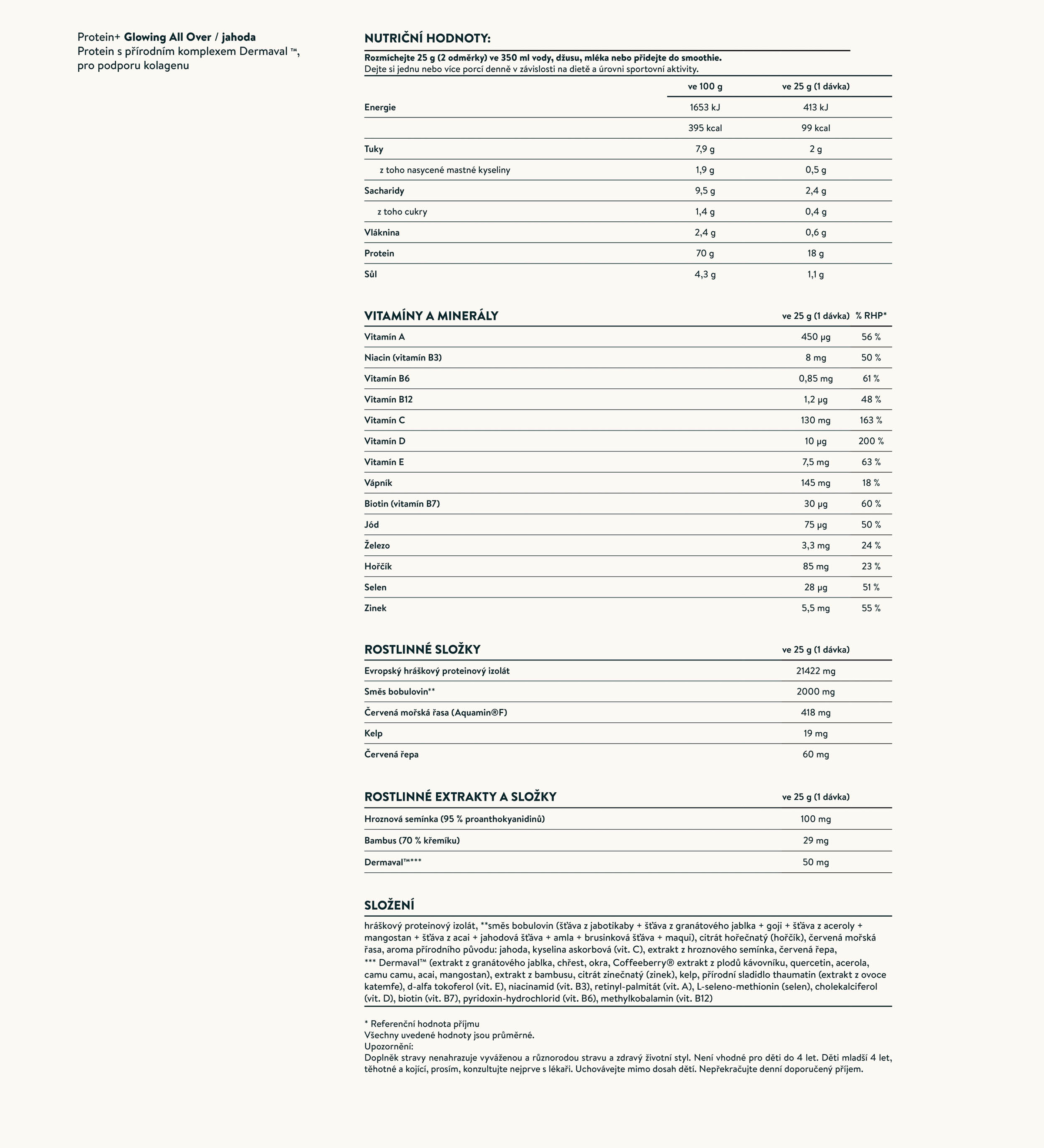 • A PROTEIN Základem je náš prémiový evropský hrachový protein. I přes jeho vysoký obsah nezatížíte svůj trávicí systém a navíc Glowing All Over skvěle chutná a dobře se mísí! Jak je to možné? Tento protein je zpracovaný patentovanou vodní extrakcí, díky níž se odstraní antinutriční látky, které způsobují zažívací obtíže.